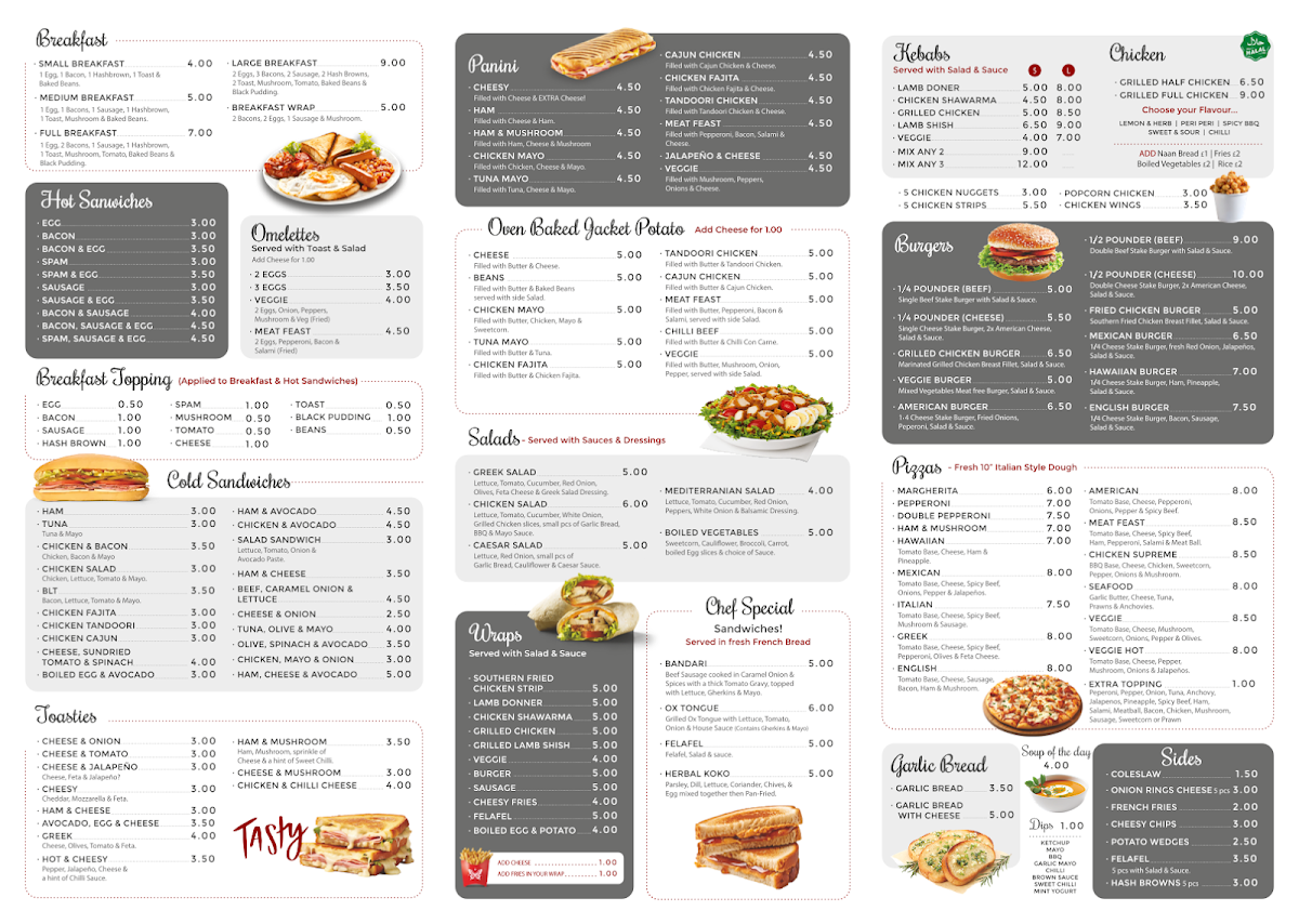 - Burgers: Indulge in a variety of burgers featuring the cheeky Fried Chicken Burger at £5.00, or the flavorful Mexican Burger for £6.50.
